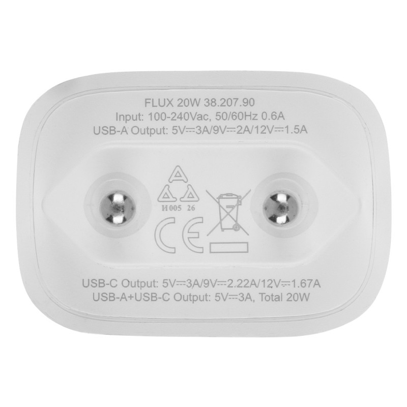 Zidni punjač snage do 20W, izrađen u GaN tehnologiji, namenjen svakodnevnom punjenju mobilnih uređaja u kućnim i poslovnim uslovima. Opremljen je USB-C i USB-A izlazima za istovremeno punjenje dva uređaja. Kao osnovni model sa ekonomičnom cenom, posebno je pogodan za velike količine i promotivne kampanje. Kompaktno kućište omogućava lako brendiranje, dok isporuka u poklon kutiji čini ovaj punjač praktičnim izborom za korporativne i B2B poklone. Ključne karakteristike: Zidni punjač za mobilne uređaje • GaN tehnologija punjača • Ukupna izlazna snaga do 20W • USB-C izlaz do 20W • USB-A izlaz • Istovremeno punjenje preko USB-C i USB-A portova (5V⎓3A) • Ulazni napon 100–240V~50/60Hz, 0.6A • Osnovni model sa ekonomičnom cenom • Pogodno za brendiranje • Poklon kutija
