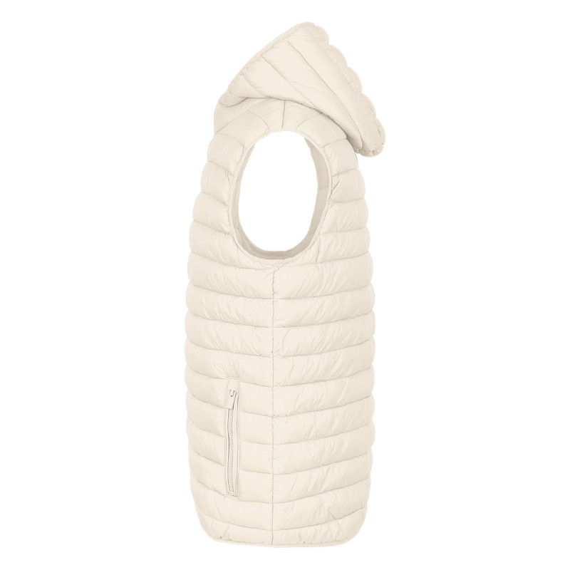 Štepani prsluk sa kapuljačom, lagano punjenje, dva prednja džepa, elastični paspuli oko ramena i džepova, vrećica za pakovanje