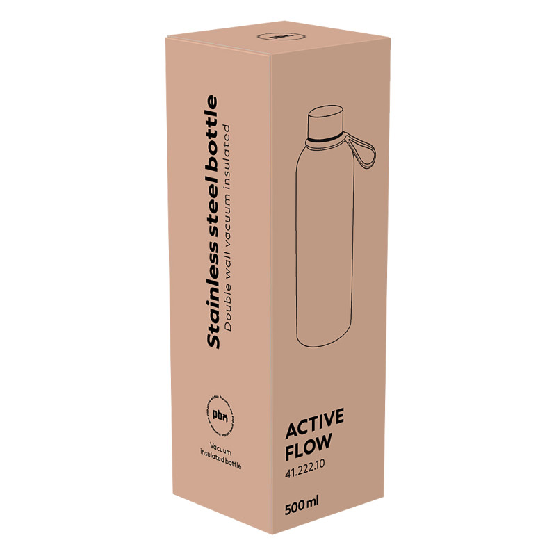 ACTIVE FLOW je termos boca u poklon pakovanju, namenjena korisnicima koji traže spoj funkcionalnosti, modernog izgleda i praktičnosti u svakodnevnoj upotrebi. Soft touch završna obrada daje boci elegantan vizuelni efekat, prijatan osećaj na dodir i omogućava kvalitetniji izgled štampe, čime se dodatno povećava njena vrednost kao promotivnog proizvoda. Zahvaljujući dvostrukom zidu sa vakuum izolacijom, napici pouzdano zadržavaju željenu temperaturu tokom dana. Dostupna je u atraktivnoj paleti boja, omogućavajući lako uklapanje u različite promotivne i poslovne koncepte. Silikonska ručka za nošenje doprinosi lakoći korišćenja u pokretu, čineći ACTIVE FLOW odličnim izborom kao poslovni poklon i promotivni proizvod, pogodan za brendiranje. Ključne karakteristike: Materijal: nerđajući čelik kvaliteta 304 • Kapacitet: 500 ml • Dvostruki zid sa vakuum izolacijom • Performanse: Termoizolacija do 12 sati (toplo/hladno) • Soft touch završna obrada • Silikonska ručka za nošenje • Nepropustan čep • Nije pogodno za pranje u mašini za sudove • Nije pogodno za upotrebu u mikrotalasnoj pećnici • Poklon pakovanje