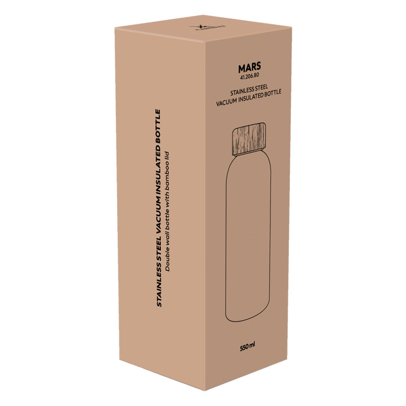 MARS vakuum izolovani termos kapaciteta 550 ml namenjen je korisnicima koji očekuju kvalitetnu izradu, dugotrajnost i moderan dizajn za svakodnevnu upotrebu. Idealan je za posao, putovanja, trening ili boravak u prirodi. Boca je izrađena od 304 nerđajućeg čelika, koji obezbeđuje otpornost na koroziju, dug vek trajanja i očuvanje prirodnog ukusa napitaka. Zahvaljujući dvostrukom zidu i vakuum izolaciji, pića duže zadržavaju željenu temperaturu, bez stvaranja kondenzacije na spoljašnjoj površini. Čep od bambusa daje proizvodu dodatnu estetsku i ekološku vrednost i pogodan je za lasersko brendiranje, što MARS bocu čini odličnim izborom za personalizovane i korporativne poklone. Proizvod dolazi u poklon pakovanju, spreman za promotivne i poslovne namene. Ključne karakteristike: Materijal: nerđajući čelik kvaliteta 304 • Kapacitet: 550 ml • Dvostruki zid sa vakuum izolacijom • Performanse: Termoizolacija do 12 sati (toplo/hladno) • Powder coating završna obrada • Nepropustan čep od bambusa • Nije pogodno za pranje u mašini za sudove • Nije pogodno za upotrebu u mikrotalasnoj pećnici • Poklon pakovanje