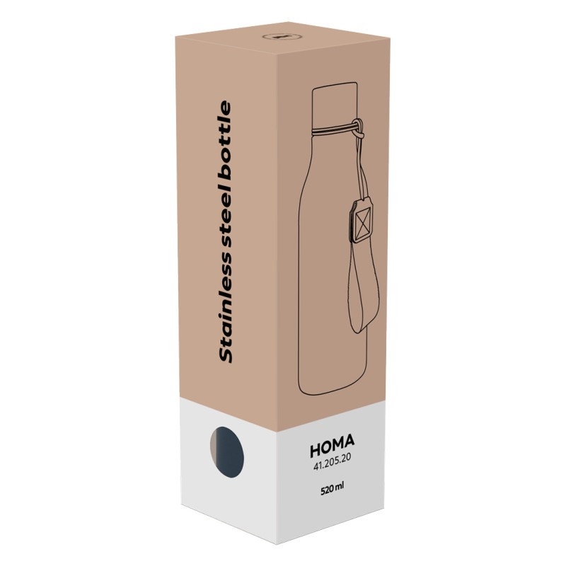 HOMA je termos boca modernog i elegantnog izgleda, namenjena korisnicima koji cene kvalitetan dizajn i izražen vizuelni efekat proizvoda. Soft touch završna obrada pruža prijatan osećaj u ruci i dodatno naglašava izgled štampe, što HOMA čini posebno pogodnom za brendiranje. Zahvaljujući dvostrukom zidu sa vakuum izolacijom, boca efikasno održava temperaturu napitaka tokom dana. Tekstilna traka za nošenje doprinosi praktičnosti, dok poklon pakovanje čini ovaj model odličnim izborom kao poslovni poklon i promotivni proizvod. Ključne karakteristike: Materijal: nerđajući čelik kvaliteta 304 • Kapacitet: 500 ml • Dvostruki zid sa vakuum izolacijom • Performanse: Termoizolacija do 12 sati (toplo/hladno) • Soft touch završna obrada • Tekstilna traka za nošenje • Nepropustan čep • Nije pogodno za pranje u mašini za sudove • Nije pogodno za upotrebu u mikrotalasnoj pećnici • Poklon pakovanje