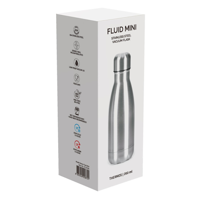 FLUID MINI je kompaktna verzija najprepoznatljivijeg oblika termos boce iz FLUID kolekcije, namenjena korisnicima kojima je potrebna praktičnost u manjem formatu. Zadržava isti univerzalni dizajn koji se masovno koristi u promociji, ali u mini dimenziji, što je čini idealnom za decu, kraće izlaske, putovanja ili svakodnevno nošenje u torbi. Zahvaljujući dvostrukom zidu sa vakuum izolacijom, FLUID MINI pouzdano održava temperaturu napitaka, uprkos manjoj zapremini. Ovaj model predstavlja funkcionalan promotivni proizvod i poslovni poklon, pogodan za brendiranje i široku primenu. Ključne karakteristike: Materijal: nerđajući čelik kvaliteta 304 • Kapacitet: 350 ml • Dvostruki zid sa vakuum izolacijom • Performanse: Termoizolacija do 12 sati (toplo/hladno) • Nepropustan čep • Nije pogodno za pranje u mašini za sudove • Nije pogodno za upotrebu u mikrotalasnoj pećnici • Poklon pakovanje