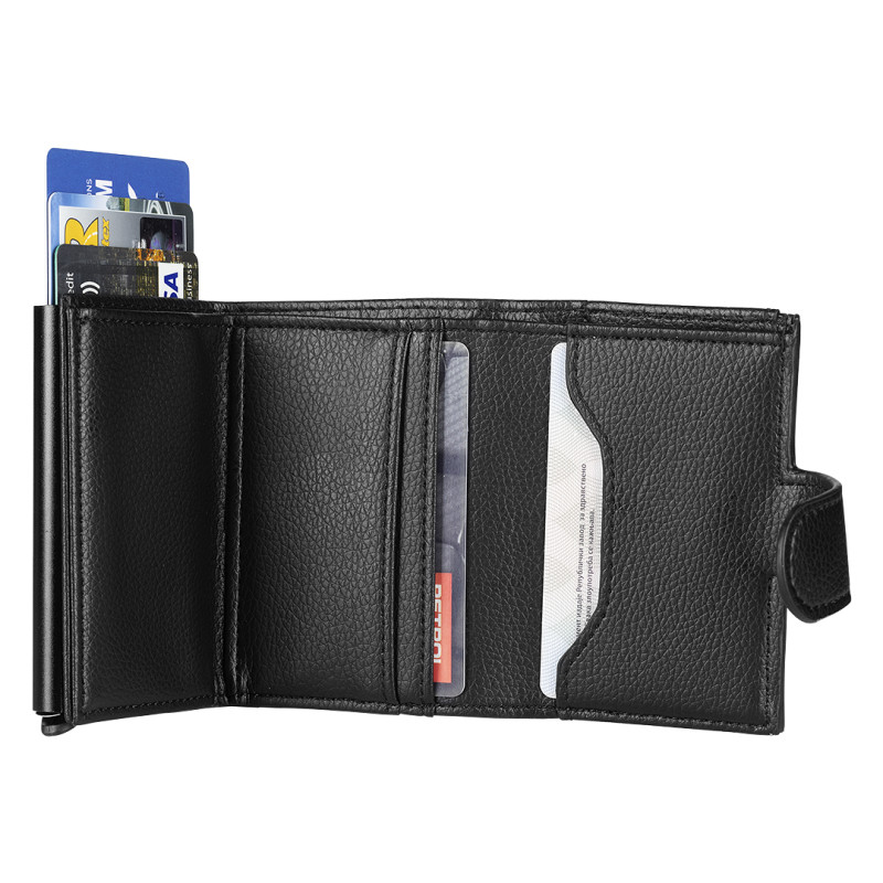 Novčanik • RFID zaštita • Eko koža • Aluminijumski držač za kartice • Pop-up mehanizam • 1 veliki odeljak • 3 unutrašnje pregrade • 1 spoljašnja pregrada • Magnetno zatvaranje • Kompaktan dizajn