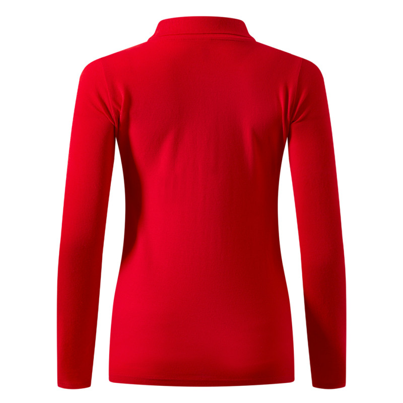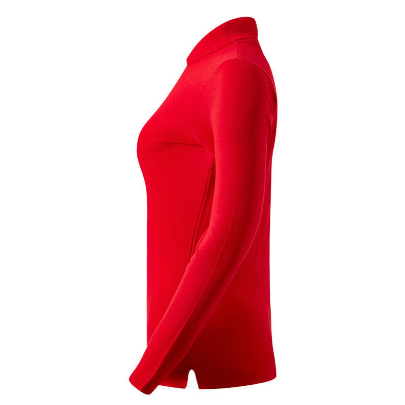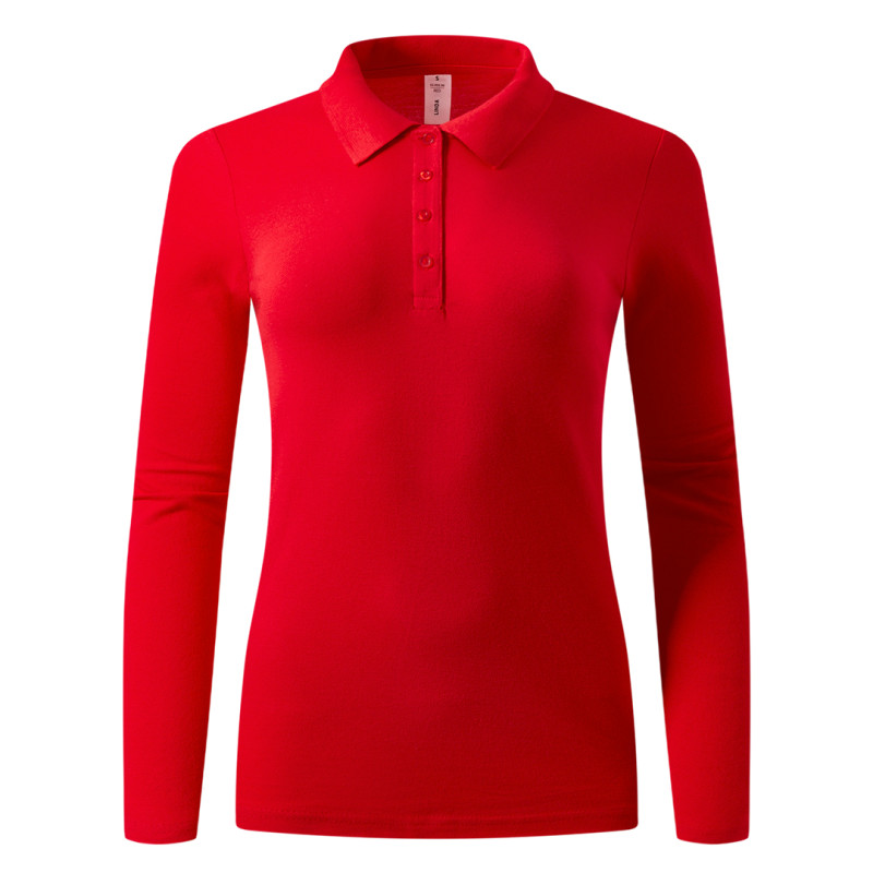 Ženska polo majica dugih rukava, 200 g/m2, blago strukirana, šivena sa strane, dupli štepovi na rukavima i dnu, četiri dugmeta u boji majice, rezervno dugme, dodatni štep duž ramena, okovratnik ojačan trakom, šlicevi sa strane