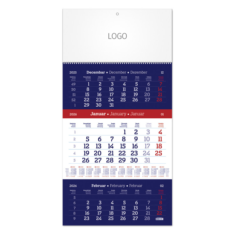 Zidni kalendar: 3 x 12 listova, tromesečni, trodelni