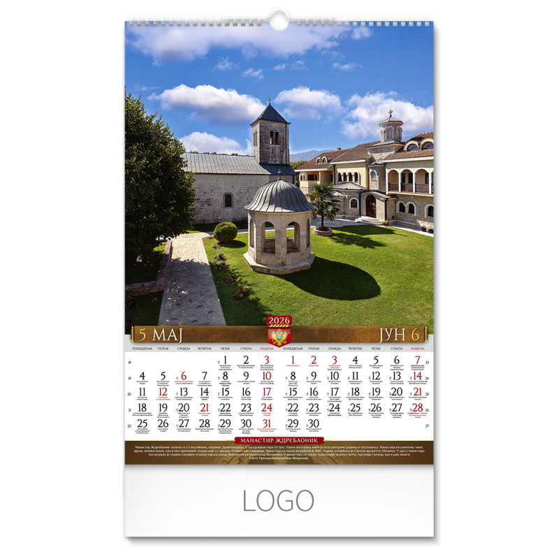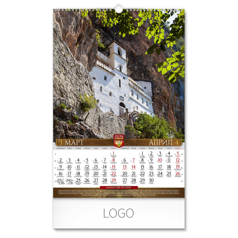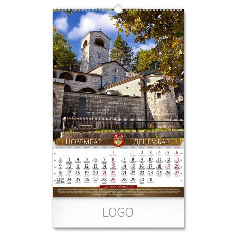 Zidni kalendar: 13 listova, mesečni, sa zlatotiskom na predlistu